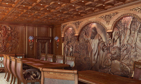 — Поздняя Готика и Эпоха Возрождения. Утилитарность переросла в искусство. Дубовые панели стали украшать сложной резьбой, геральдическими символами и орнаментами. Этот стиль, известный как «вайнскот» или обшивка, стал символом статуса и богатства. Панели уже не тянулись до потолка, а занимали нижнюю часть стены, оставляя верх для гобеленов, фресок или тканей.