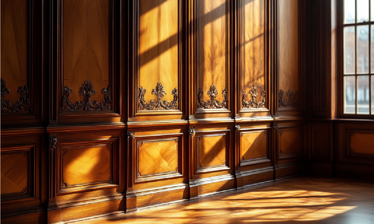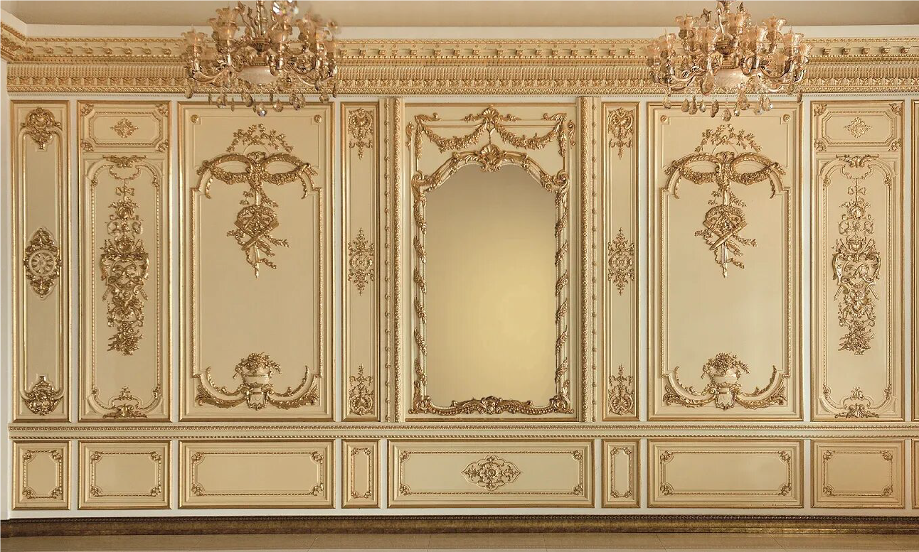 — Эпоха Барокко и Рококо. В дворцах французских королей (например, в Версале) стеновые панели достигли пика изящества. Их делали из редких пород дерева, инкрустировали золотом, серебром, перламутром и черепаховым панцирем (техника Маркетри и Буль). Панели стали частью единого ансамбля с мебелью и интерьером.